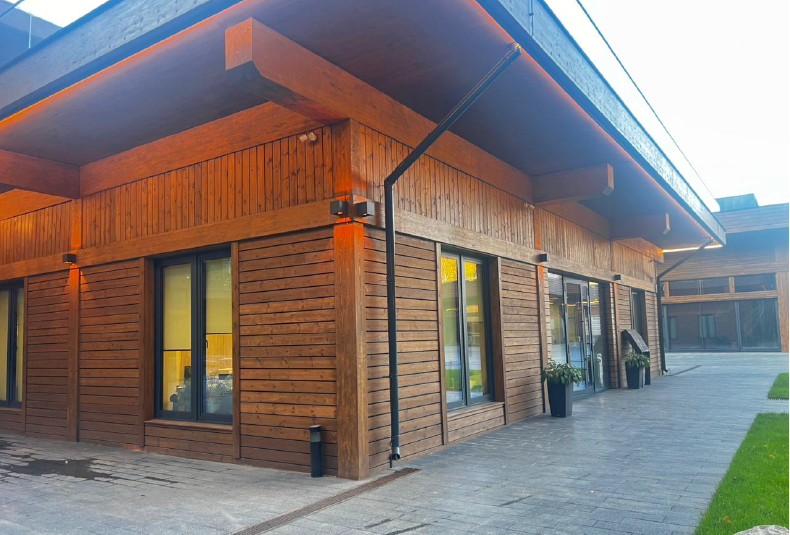 Для декоративной обшивки зданий была выбрана сибирская лиственница. Эта древесина не просто красива — она со временем только укрепляется, стойко перенося дождь, солнце и мороз.